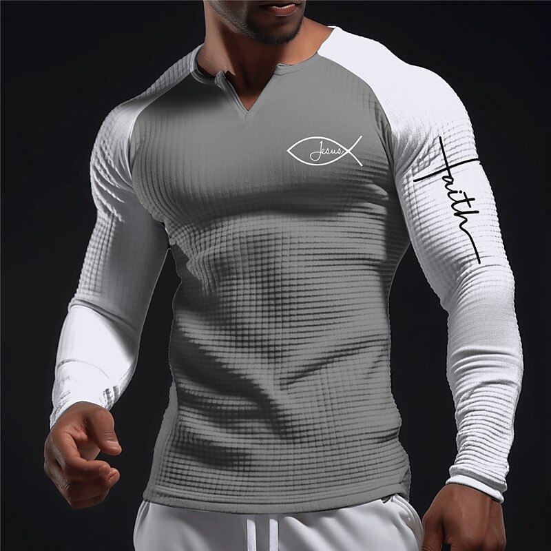 Graphic Color Block Faith Daily Classic Outdoor Men's 3D Print T shirt Tee Raglan T Shirt Waffle T Shirt Sports Outdoor Casual Going out T shirt Black White Dark Blue Long Sleeve V Neck Shirt Spring